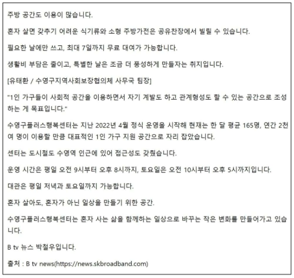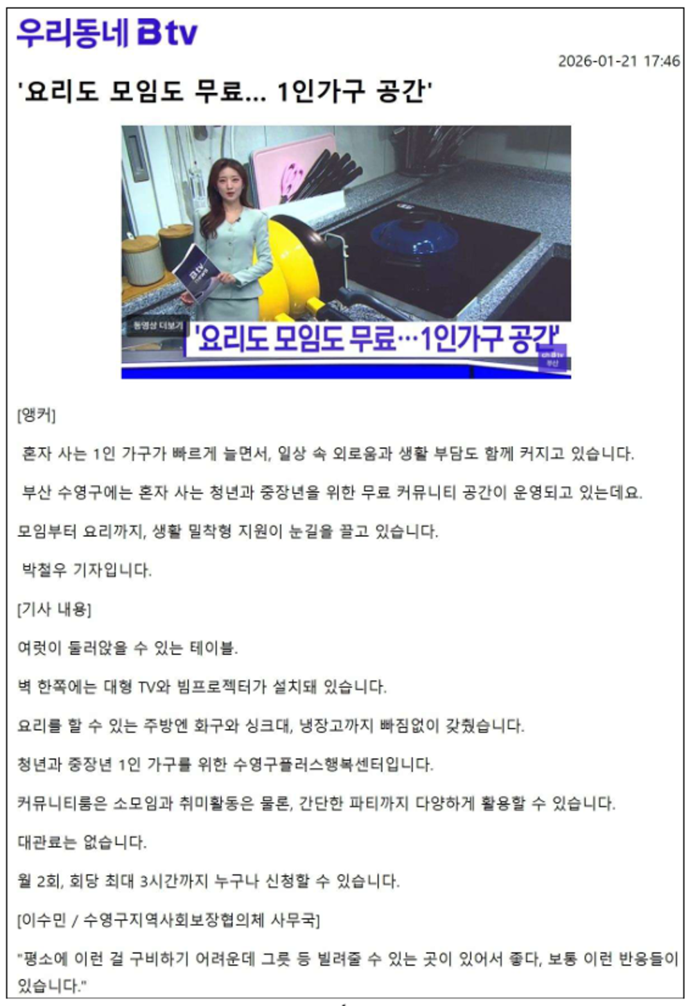 '요리도 모임도 무료… 1인가구 공간' < 사회 < 부산 < 기사본문 - B tv news